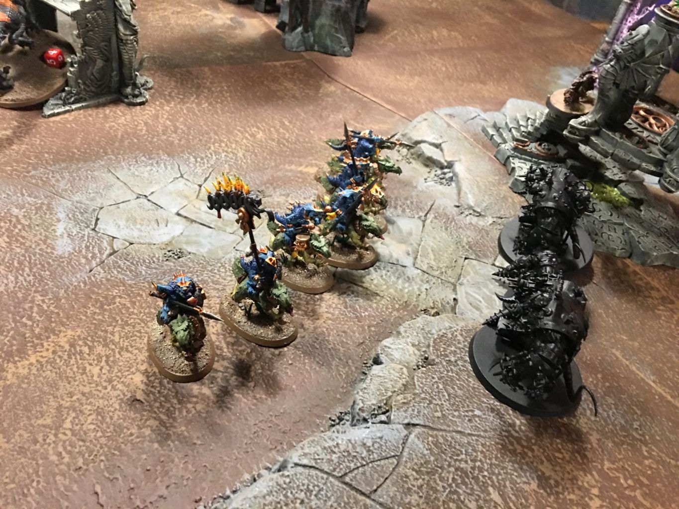 - Beide Armeen lieferten sich Beschuss, wobei der Clan Skyre oft Würfelpech hatte und hierdurch weniger Schaden verursachte als er hätte anrichten können