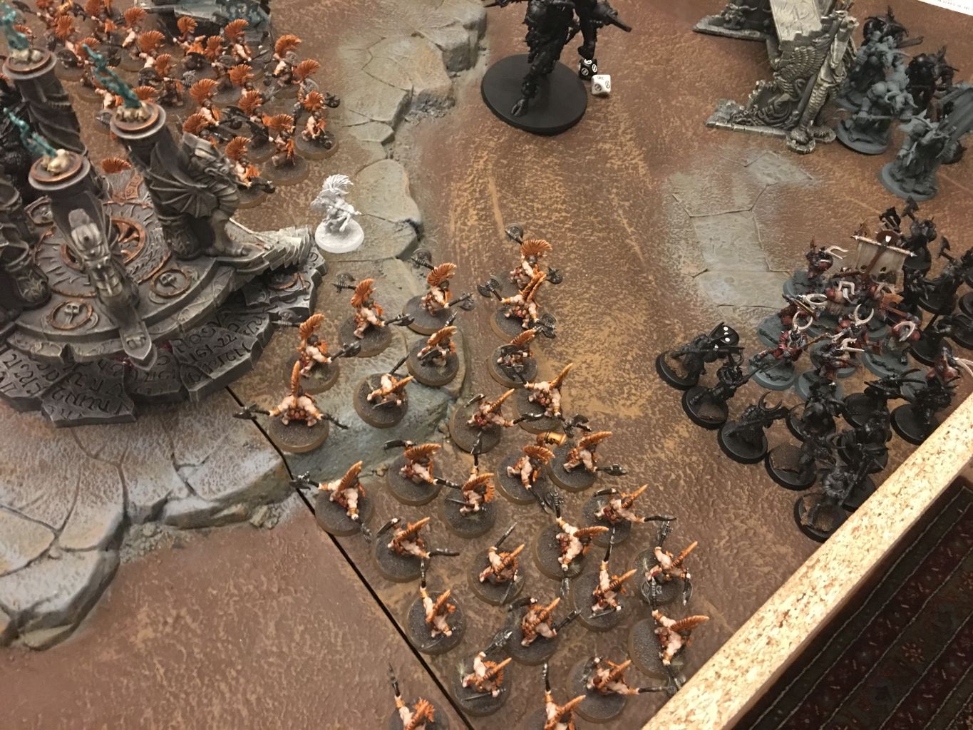 - Eine Einheit Auric Hearthguard kam mit einem Runesmiter aus der Erde im Rücken der gegnerischen Armee