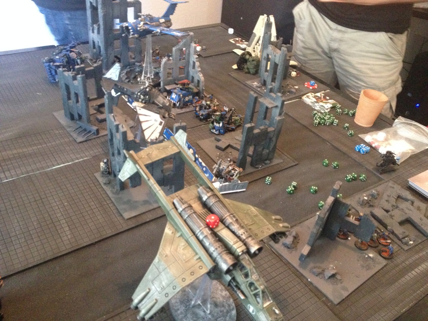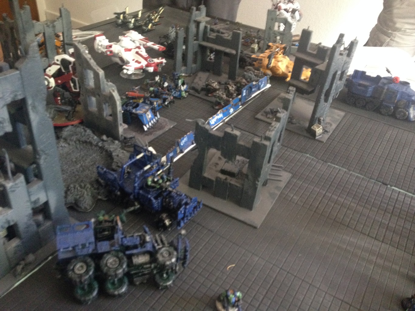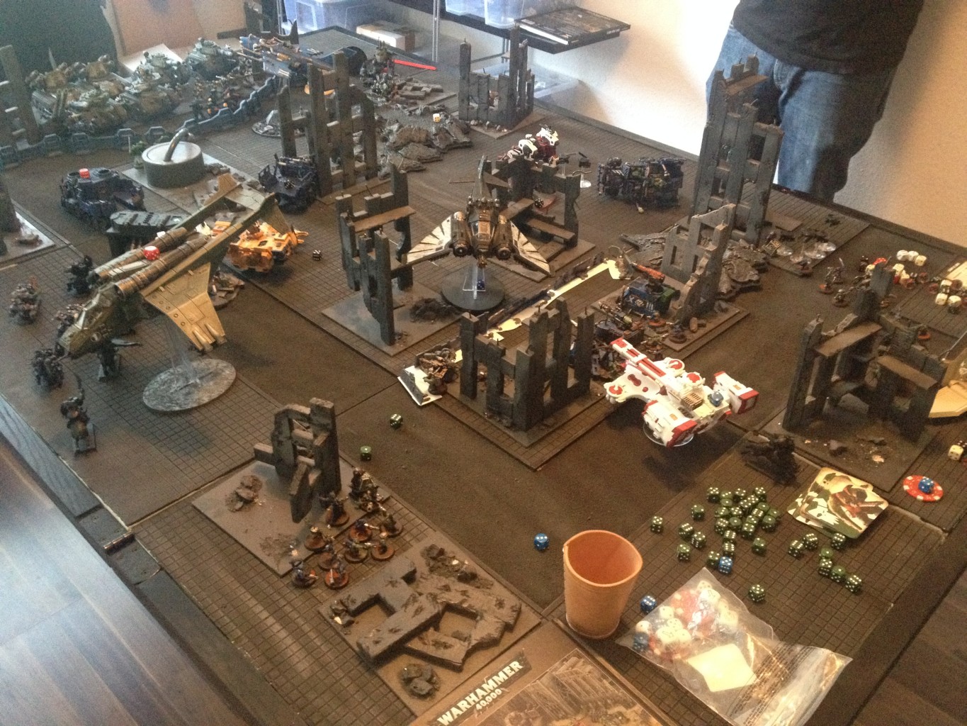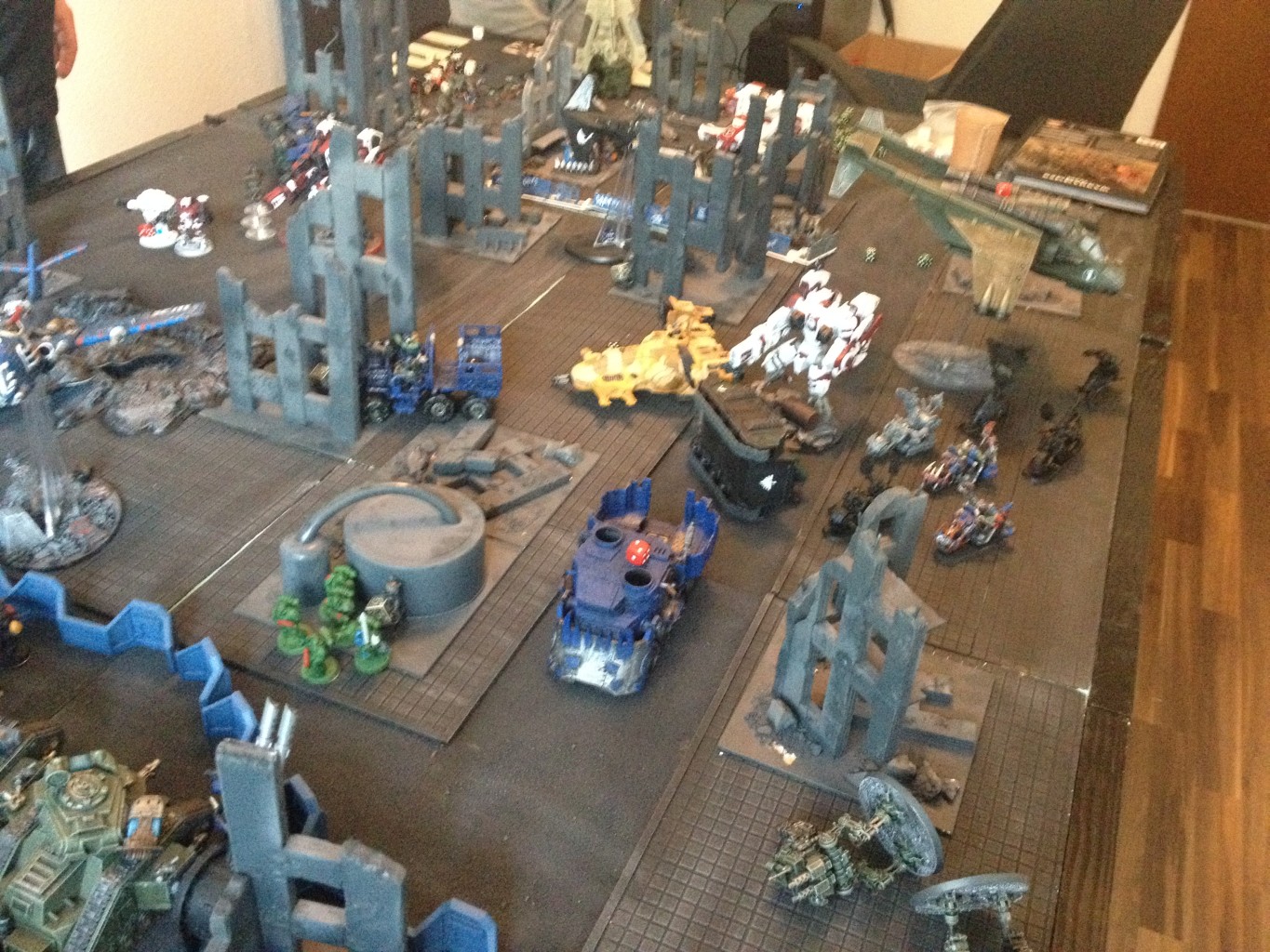 Thufir hat nachträglich zu seinem Geburtstag zu einer Warhammer 40.000 Schlacht eingeladen. Gespielt wurde ein 2-vs-3 (Dark Angels (Thufir) und Astra Militarum (Tito Fuente) -vs- 2x Orks (Ben und Felix) und Tau (Kalatas)). Ursprünglich war ein 3-vs-3 mit den Space Marines von Imperator Swenson geplant, doch dieser ist krankheitsbedingt ausgefallen.