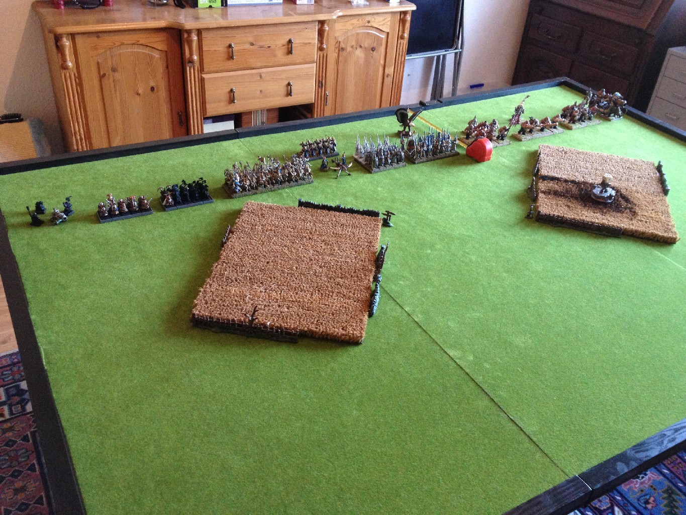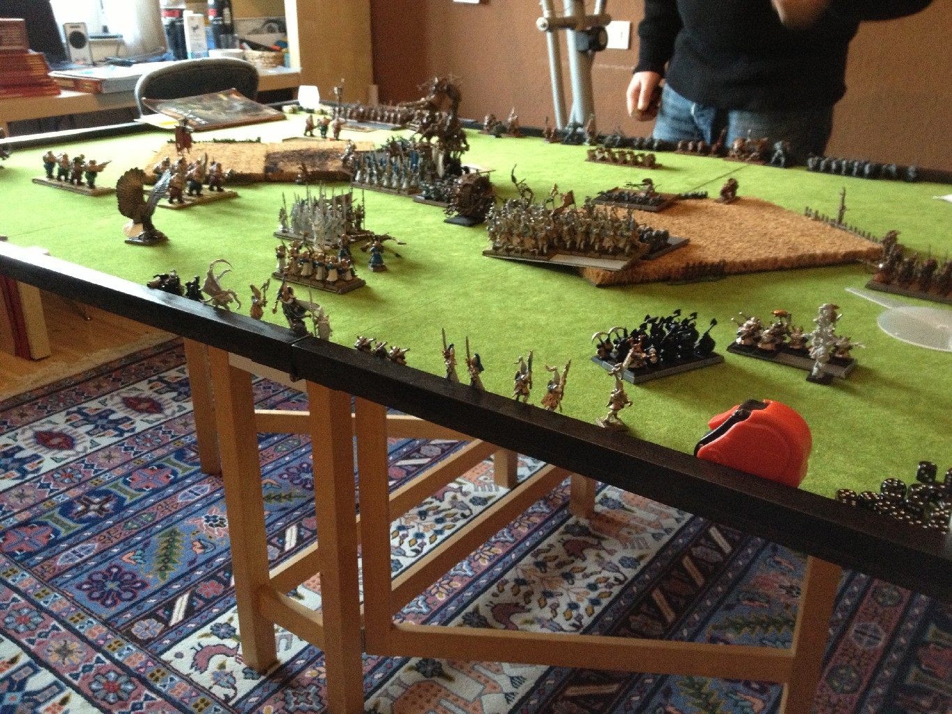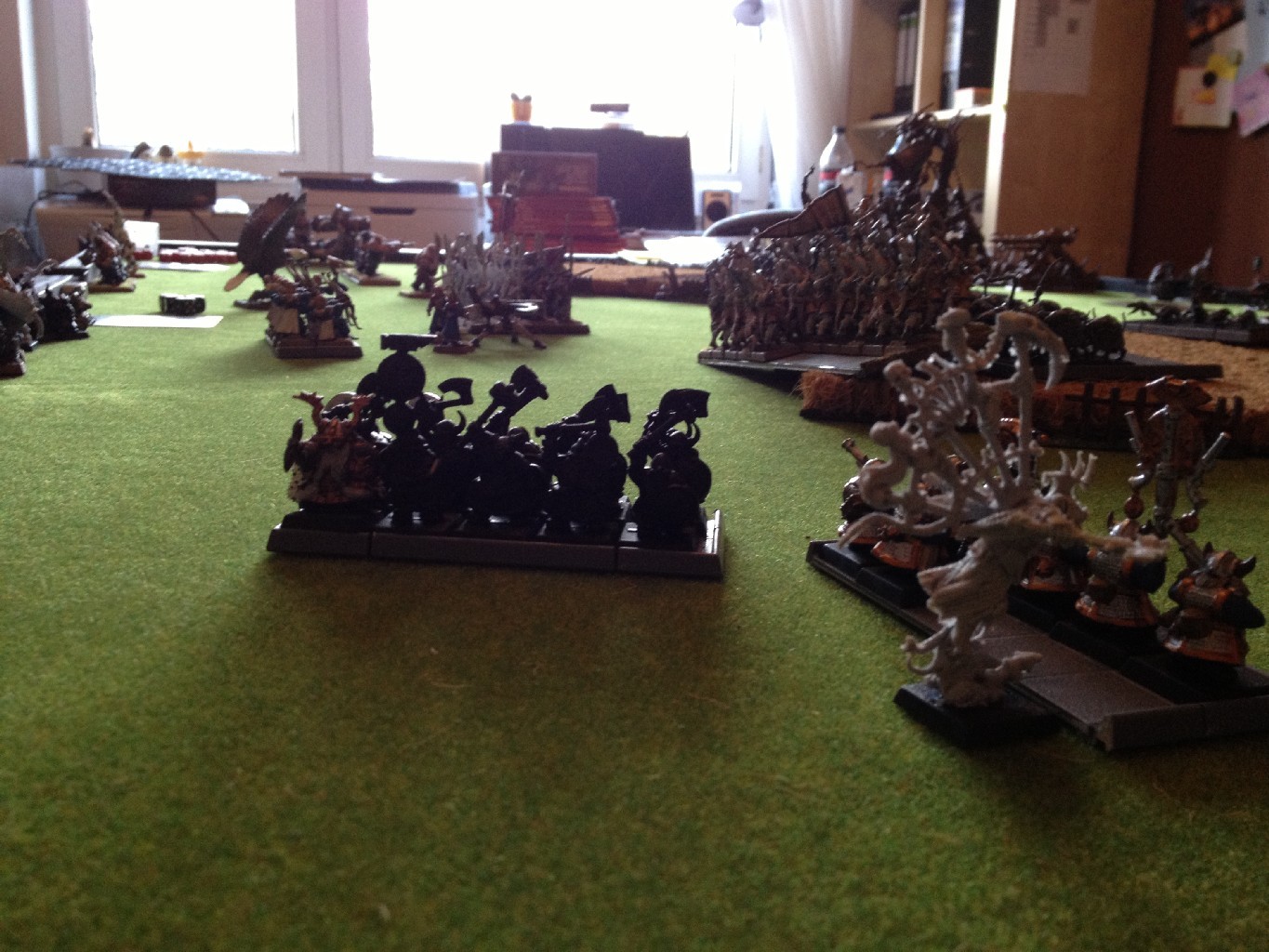 Letzten Samstag fand in aller Eile eine erste große Megaschlacht statt. Thufir trat mit seiner 3200 Punkten starken Skaven-Armee gegen das Bündnis aus Hochelfen (1697) und Zwergen (498) (beide gespielt von TitoFuente). Hilfe bekam das Bündnis von ein paar Ogern (1005) welche vom Newcomer Chris befehligt wurden.