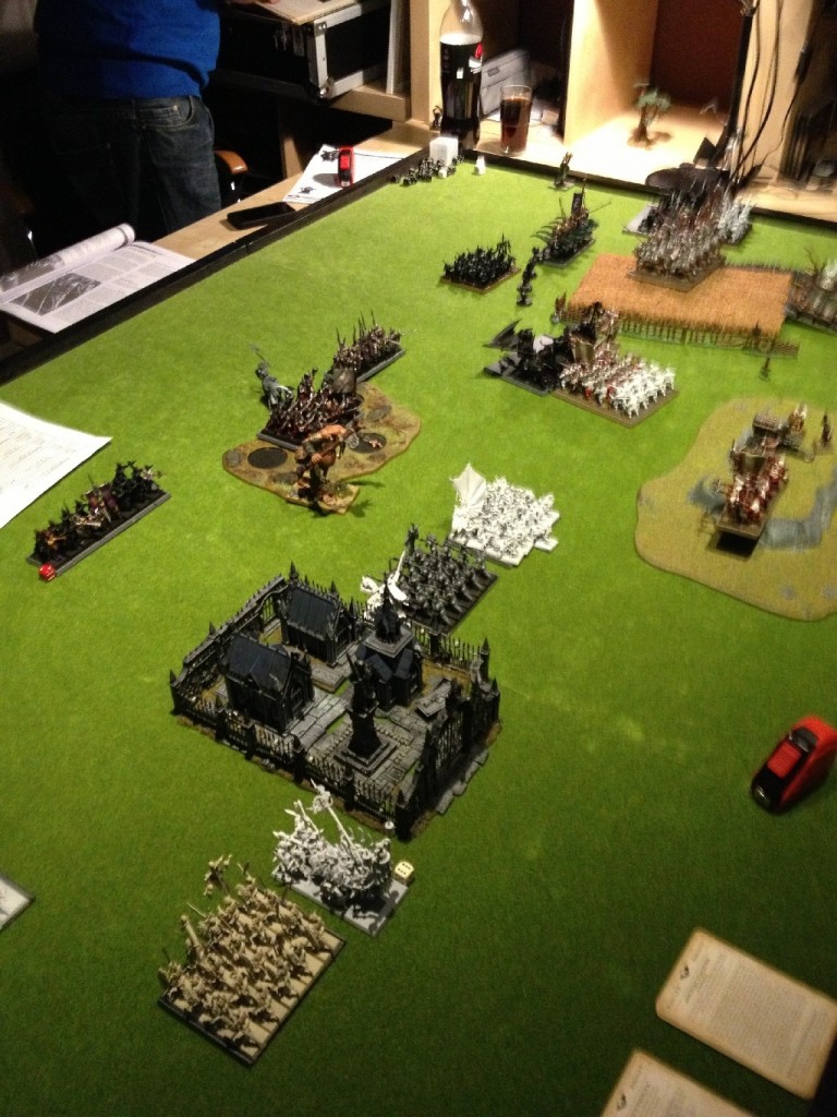 Die Schlacht begann sehr ausgeglichen und spannend. Die Grünhäute und Dunkelelfen hatten den ersten Spielzug. Recht schnell sprengte sich der Schamane der Goblins durch einen Kontrollverlust in die Luft.Die unheilige Allianz war bis Runde zwei ein wenig im Nachteil, da die Verluste hier größer waren. Die Vampire konnten ihre Magie nicht richtig zum tragen bringen, Beschuss war auch nicht zu erwarten. So musste das Imperium den Beschuss übernehmen.