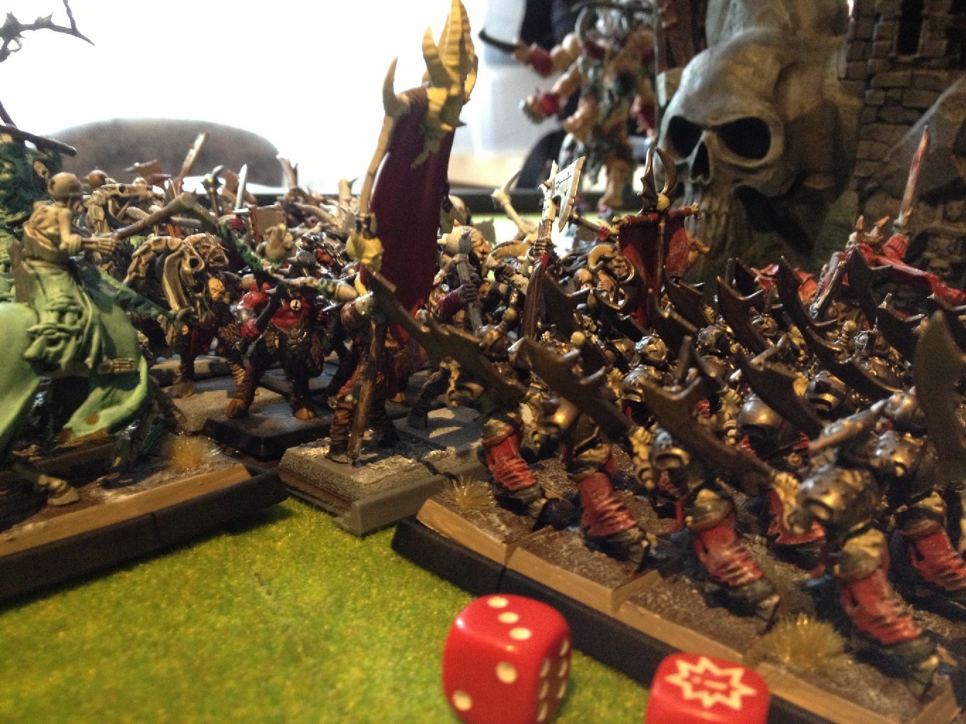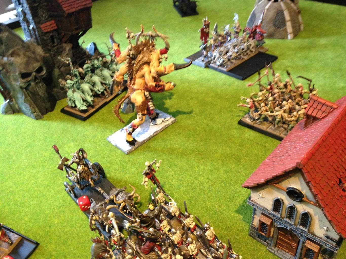 Zwei schöne Spiele in denen beide Seiten auch viel Lehrgeld zahlen mussten. Die Tiermenschen haben sich um Hindernisse verhaspelt in Schlacht 1, den Vampirfürsten wurde in Schlacht 2 bewußt wie stark sie doch auf Energiewürfel in der Magiephase angewiesen sind. Kein Würfelglück hier. 🙂